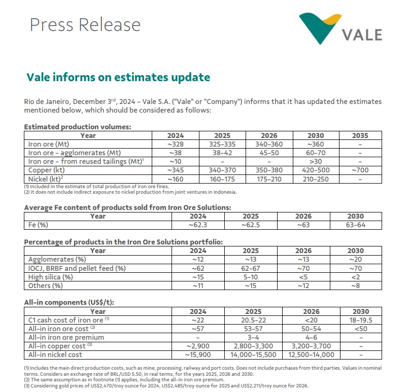當地時間12月3日,淡水河谷發布公告稱,預計2024年鐵礦石產量約為3.28億噸,2025年為3.25-3.35億噸,2026年為3.4-3.6億噸,2030年約為3.6億噸。