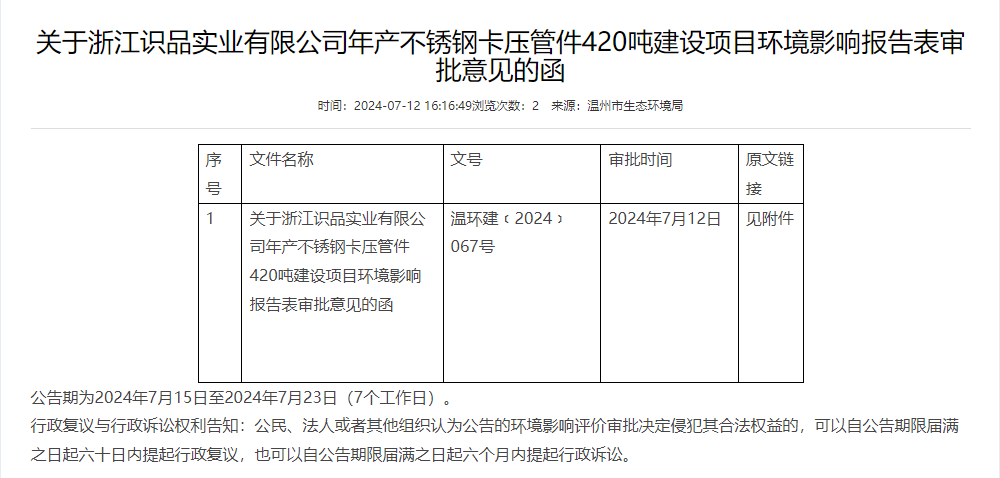7月12日,溫州市生態(tài)環(huán)境局就浙江識(shí)品實(shí)業(yè)有限公司年產(chǎn)420噸不銹鋼卡壓管件建設(shè)項(xiàng)目環(huán)境影響報(bào)告表作出審批意見并對(duì)外進(jìn)行公告,公告期為2024年7月15日至2024年7月23日(7個(gè)工作日)。