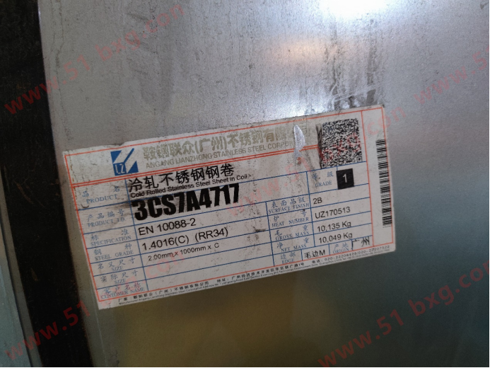 據(jù)本網(wǎng)跟進(jìn)了解,此為鋼廠出口歐洲的430材料。在產(chǎn)品標(biāo)簽的標(biāo)準(zhǔn)一欄也是寫(xiě)了EN 10088-2字樣。