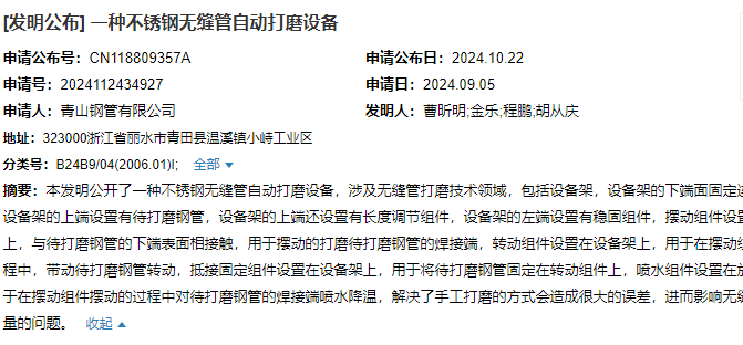 2024年10月22日,青山鋼管有限公司成功申請(qǐng)一項(xiàng)名為“一種不銹鋼無縫管自動(dòng)打磨設(shè)備”專利,申請(qǐng)公布號(hào)為CN118809357A,申請(qǐng)日期為2024年9月5日。